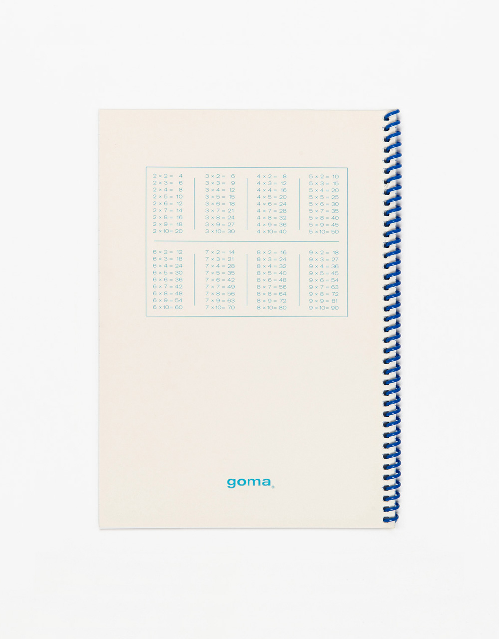goma® composition books are coil-bound, custom-ruled graph/grid sheets and feature fountain pen-friendly paper. Intended to be filled with coloured pencils and markers, they also boast a handy multiplication table chart on the back cover for the young’uns. Sleekly laid, tasteful to the touch and printed with water-based inks. 17 × 24 cm (6,7 × 9,4 in), 50 pages of responsibly sourced paper matter. Pesticide-free. Made in Athens, Greece.